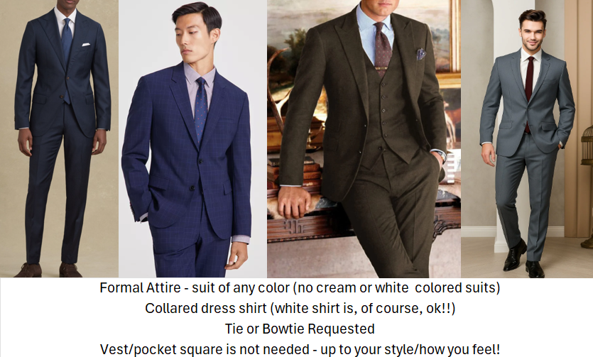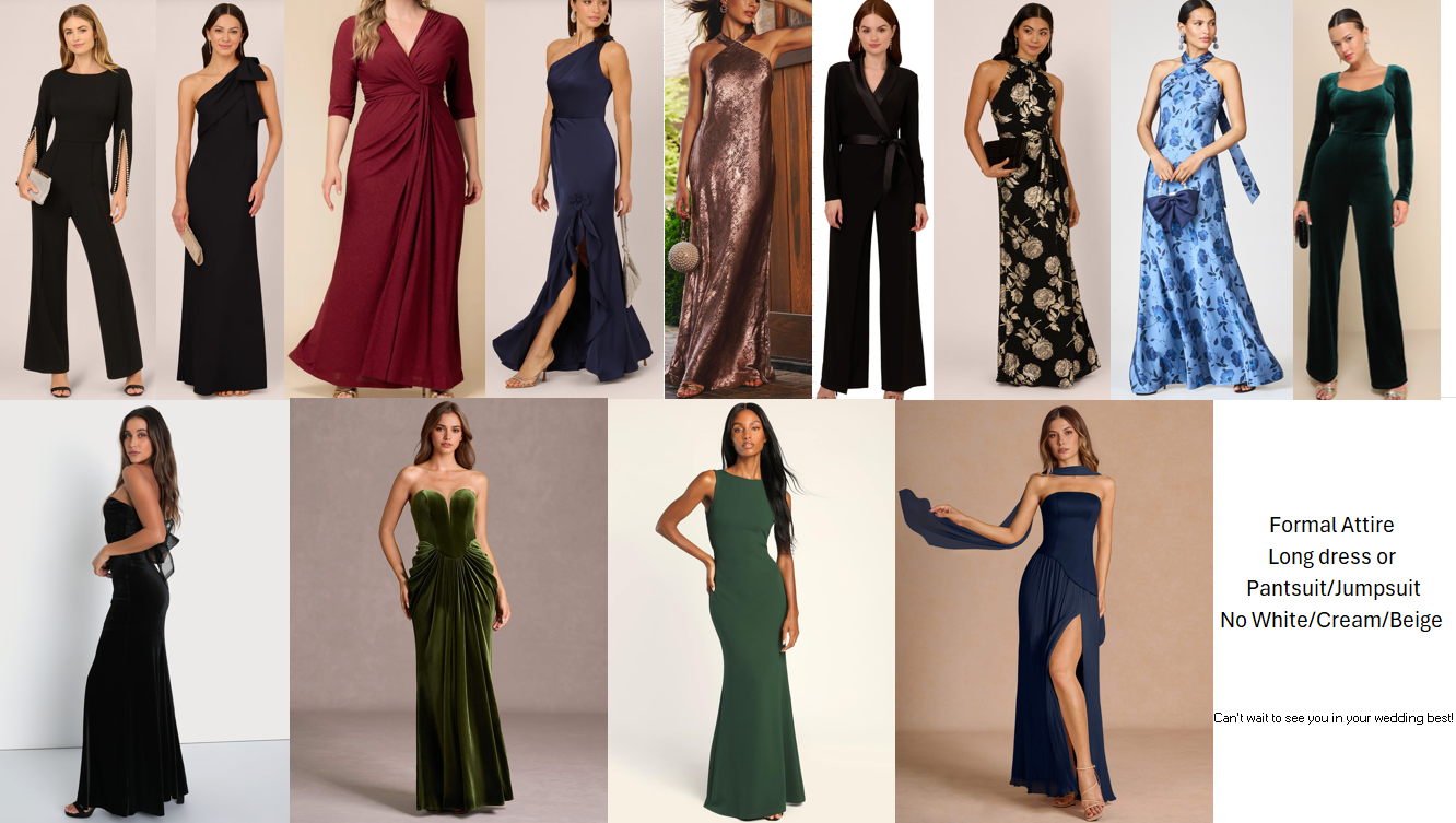 Formal, please! For the wedding, we ask that all women wear full length dresses / nice suits / jumpsuit and the men wear suits and jackets. The wedding is in a castle so feel free to bring your best royal vibes!